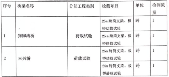 2.項(xiàng)目內(nèi)容:對碧峰峽路下段道路狗腳灣橋、三興橋進(jìn)行動、靜荷載試驗(yàn)。