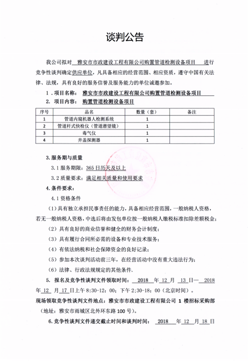 市政公司購置管道檢測設(shè)備項(xiàng)目的競爭性談判公告
