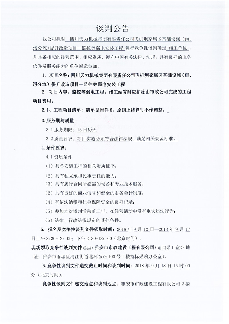 四川天力機(jī)械集團(tuán)有限責(zé)任公司飛機(jī)壩家屬區(qū)基礎(chǔ)設(shè)施(雨、污分流)提升改造項(xiàng)目——監(jiān)控等弱電安裝工程(競爭性談判公告)