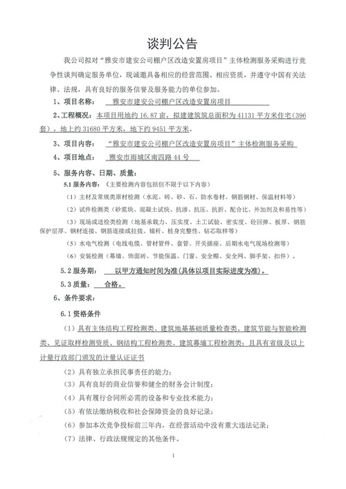 雅安市建安公司棚改區(qū)改造安置房項(xiàng)目主體檢測服務(wù)競爭性談判公告