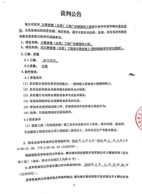大興壹號(hào)(北苑)工程廣告牌圍擋工程競爭性談判公告