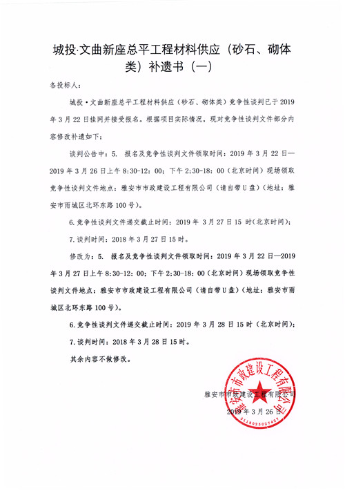 城投·文曲新座總平工程材料供應(yīng)(砂石、砌體類)競爭性談判公告補遺一
