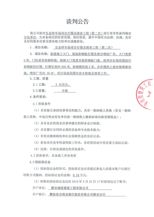 生態(tài)停車(chē)場(chǎng)項(xiàng)目打圍及清表工程競(jìng)爭(zhēng)性談判公告(第二次)