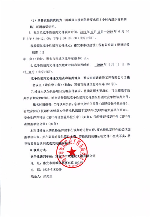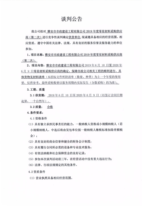 市政公司2019年度零星材料采購供應(yīng)商競爭性談判公告(第二次)