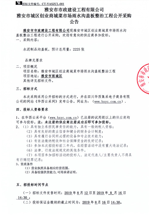 雅安市城區(qū)創(chuàng)業(yè)商城菜市場(chǎng)雨水溝蓋板整治工程公告