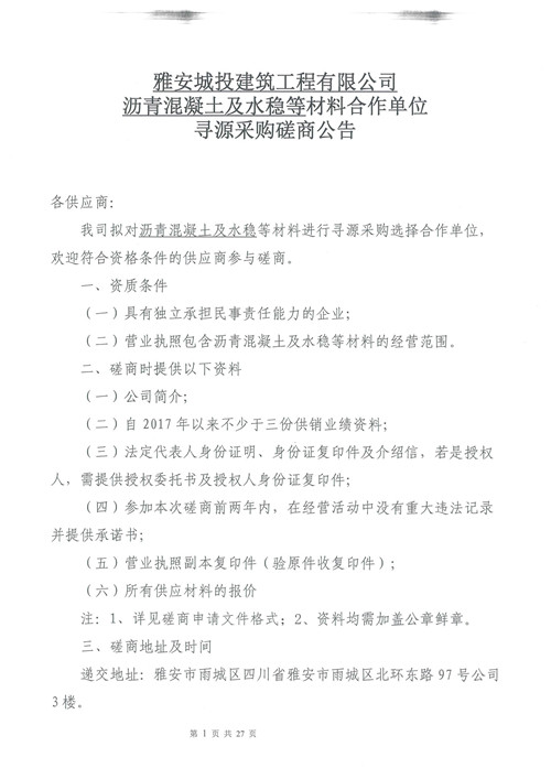 城投建工公司瀝青混凝土及水穩(wěn)等材料合作單位尋源采購磋商公告