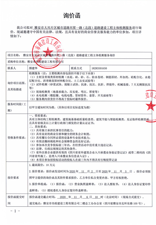雅安市大興片區(qū)城市道路興貿(mào)一路(北段)道路建設(shè)工程主體檢測(cè)服務(wù)詢(xún)價(jià)函