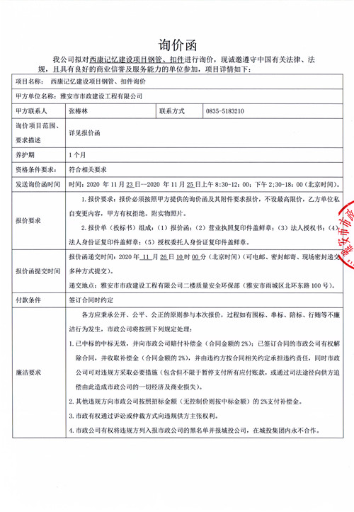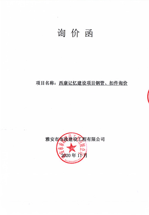 市政公司西康記憶建設(shè)項(xiàng)目鋼管、扣件詢價(jià)函