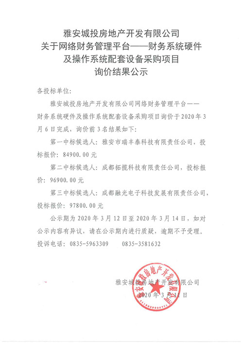 城投房地產(chǎn)公司關于網(wǎng)絡財務管理平臺——財務系統(tǒng)硬件及操作系統(tǒng)配套設備采購項目詢價結果公示