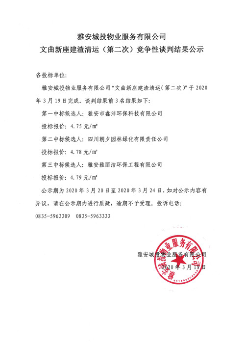 城投物業(yè)公司文曲新座建渣清運(第二次)競爭性談判結(jié)果公示