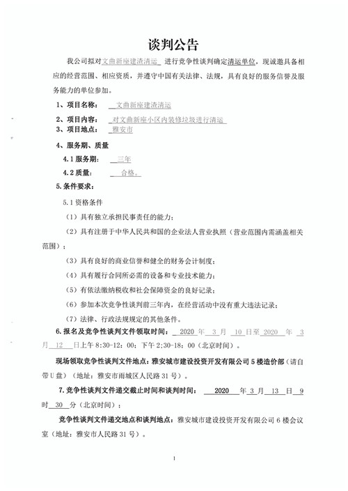 物業(yè)公司文曲新座建渣清運(yùn)確定清運(yùn)單位的競(jìng)爭性談判公告