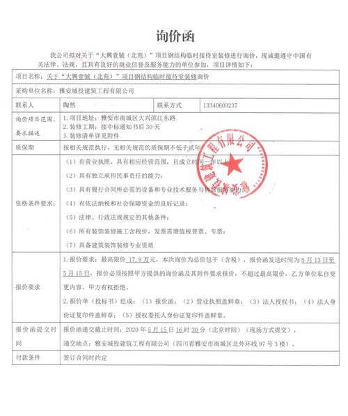 城投建工公司“大興壹號(hào)(北苑)”項(xiàng)目鋼結(jié)構(gòu)臨時(shí)接待室裝飾裝修詢價(jià)函