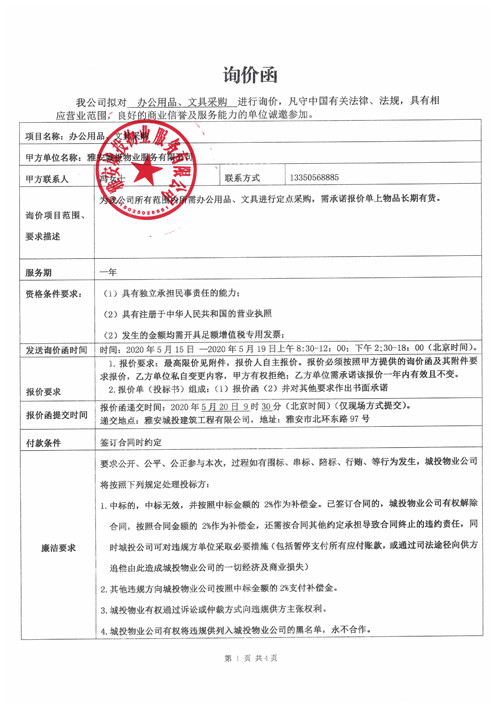 城投物業(yè)公司辦公用品、文具采購詢價(jià)函