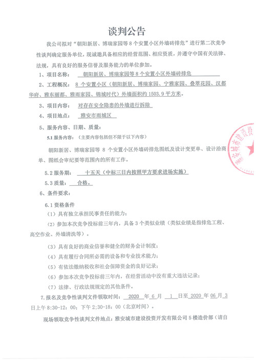 城投公司“朝陽(yáng)新居、博瑞家園等8個(gè)安置小區(qū)外墻磚排!备(jìng)爭(zhēng)性談判公告(第二次)