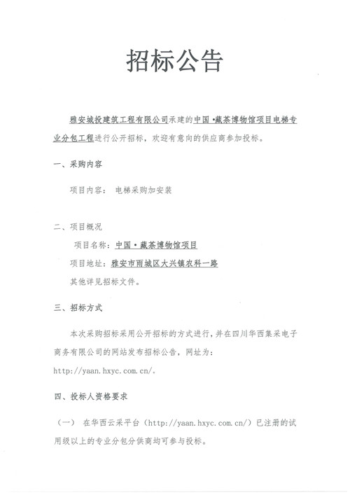 城投建工公司中國·藏茶博物館項目電梯專業(yè)分包工程招標公告