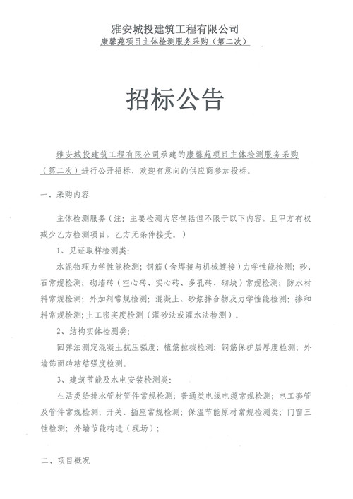 城投建工公司康馨苑項目主體檢測服務(wù)招標(biāo)公告(第二次)