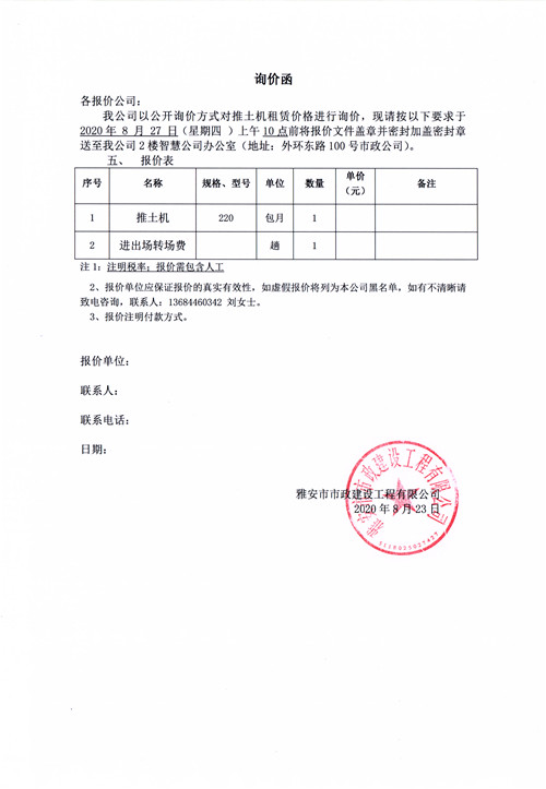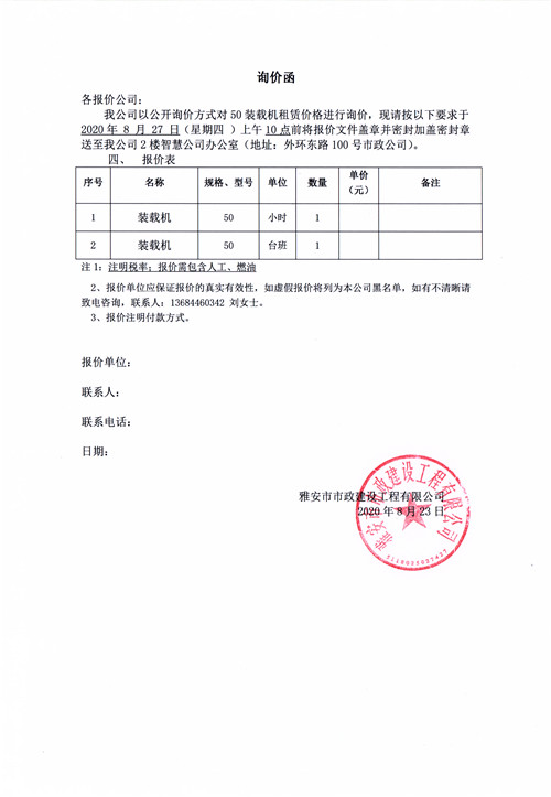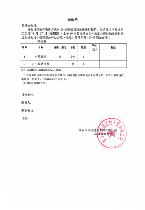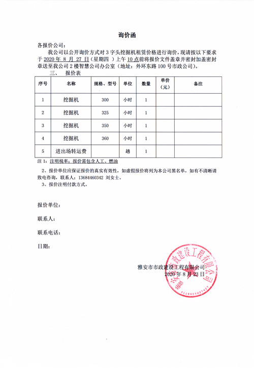 雅安市市政建設工程有限公司挖掘機租賃詢價函