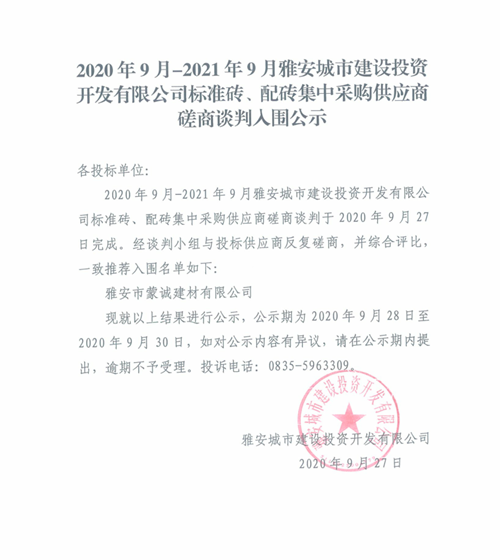 2020年9月-2021年9月雅安城市建設(shè)投資開發(fā)有限公司標準磚、配磚集中采購供應(yīng)商磋商談判入圍公示