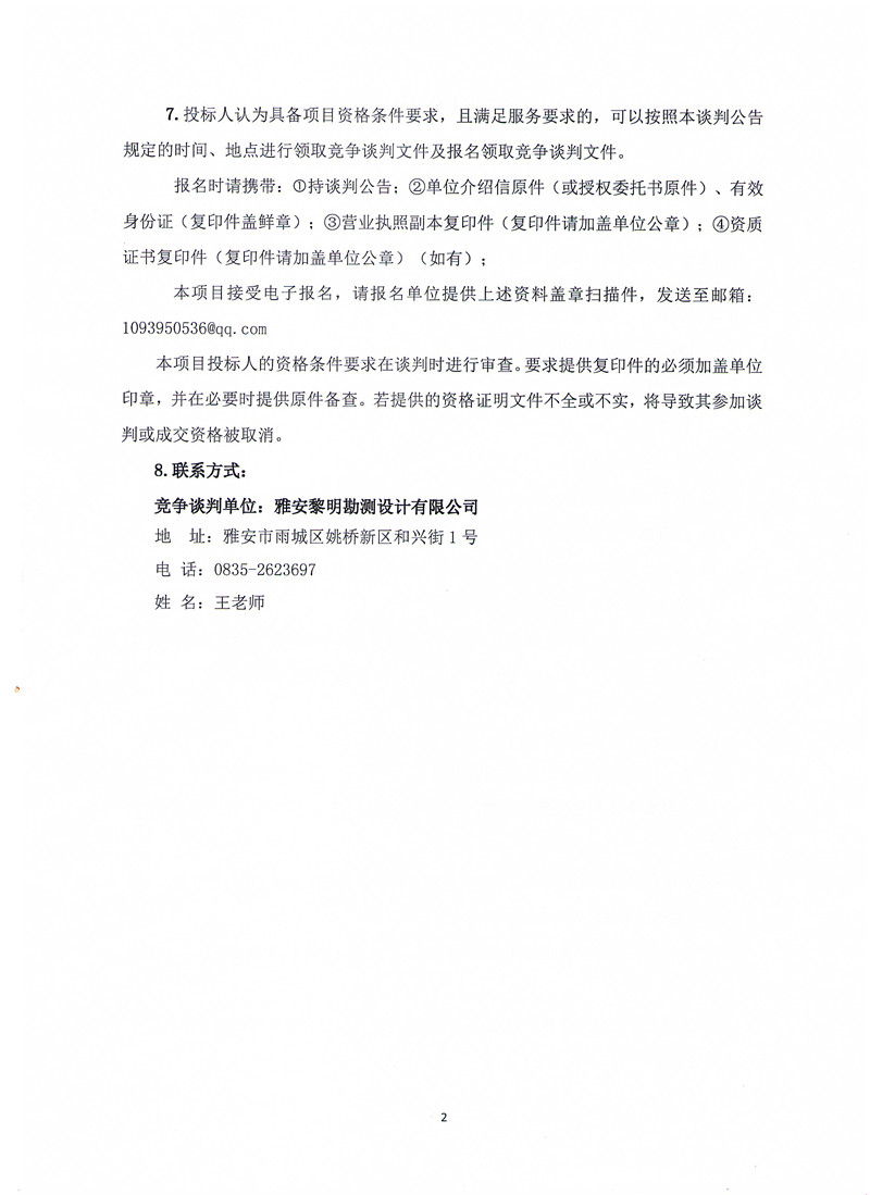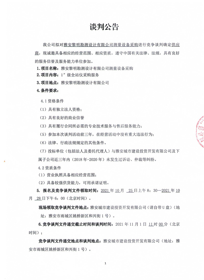 雅安黎明勘測設計有限公司測量設備采購競爭性談判公告