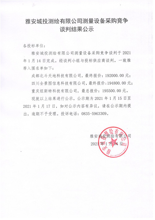 雅安城投測繪有限公司測量設備采購競爭談判結果公示