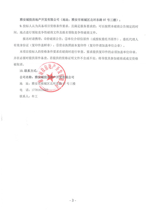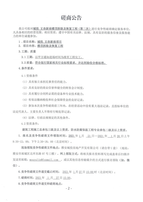 雅安城投房地產(chǎn)開發(fā)有限公司城投·文曲新座樓頂拆除及恢復(fù)工程(第二次)競(jìng)爭(zhēng)性磋商公告