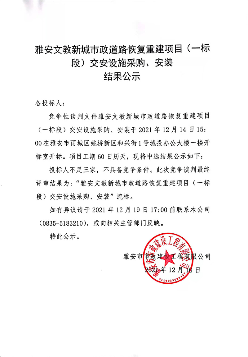 雅安文教新城市政道路恢復重建項目(一標段)交安設施采購、安裝結(jié)果公示