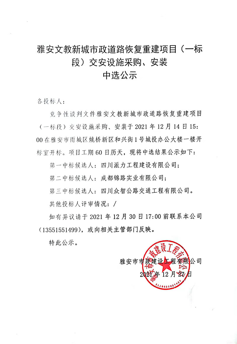 雅安文教新城市政道路恢復(fù)重建項目(一標(biāo)段)交安設(shè)施采購、安裝中選公示