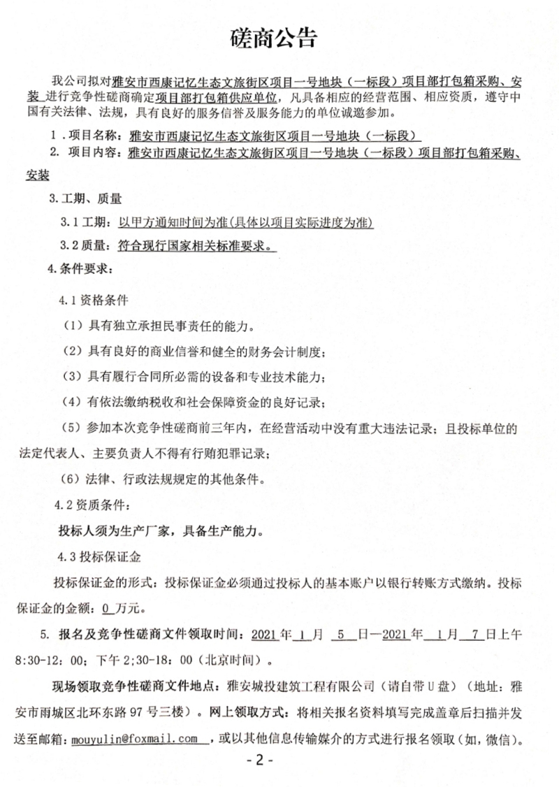 雅安市西康記憶生態(tài)文旅街區(qū)項目一號地塊(一標段)項目部打包箱采購、安裝競爭性磋商公告