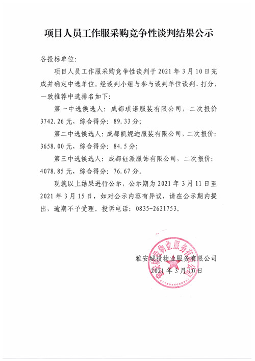 城投物業(yè)公司項目人員工作服采購競爭性談判結果公示