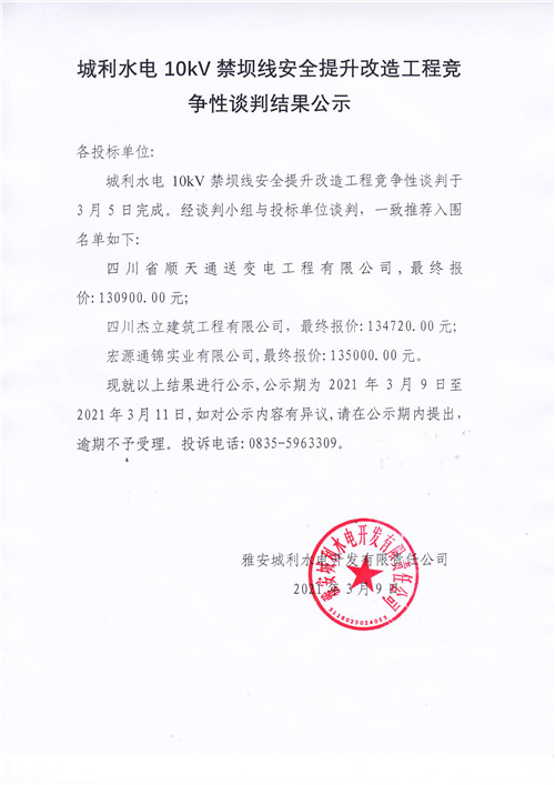 城利水電公司10kV禁壩線安全提升改造工程競爭性談判結(jié)果公示