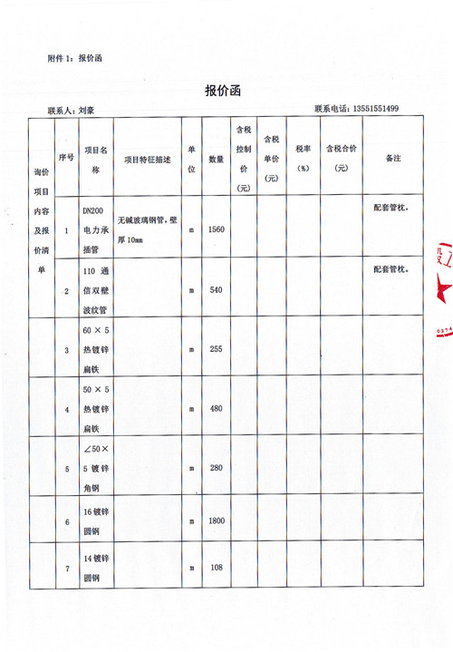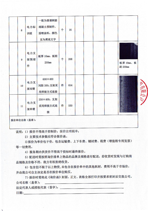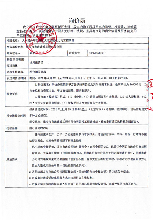 雅安市政公司大興南外環(huán)至新區(qū)大道三段電力溝工程項(xiàng)目電力排管、檢查井、接地等材料詢價函詢價