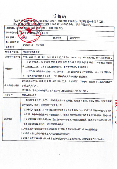 雅安市政公司金鳳山公園南坡入口項目-照明材料詢價函