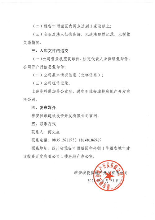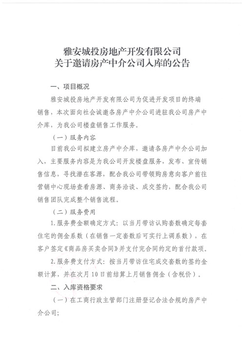 雅安城投房地產(chǎn)開發(fā)有限公司關于邀請房地產(chǎn)中介公司入庫的公告