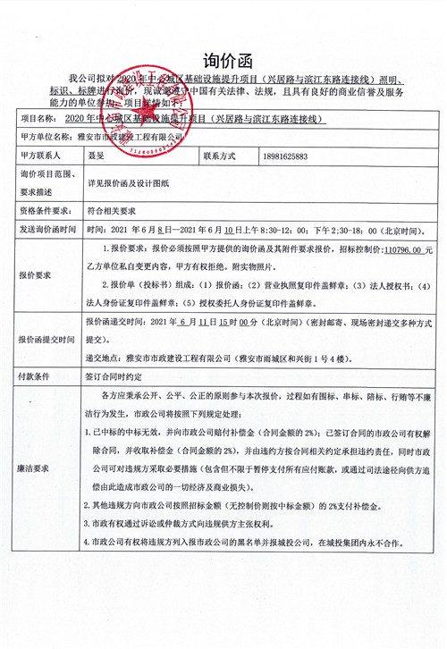 雅安市政公司2020年中心城區(qū)基礎(chǔ)設(shè)施提升項(xiàng)目(興居路與濱江東路連接線)照明、標(biāo)識、標(biāo)牌詢價(jià)函