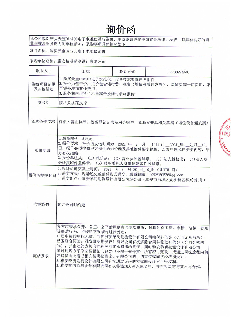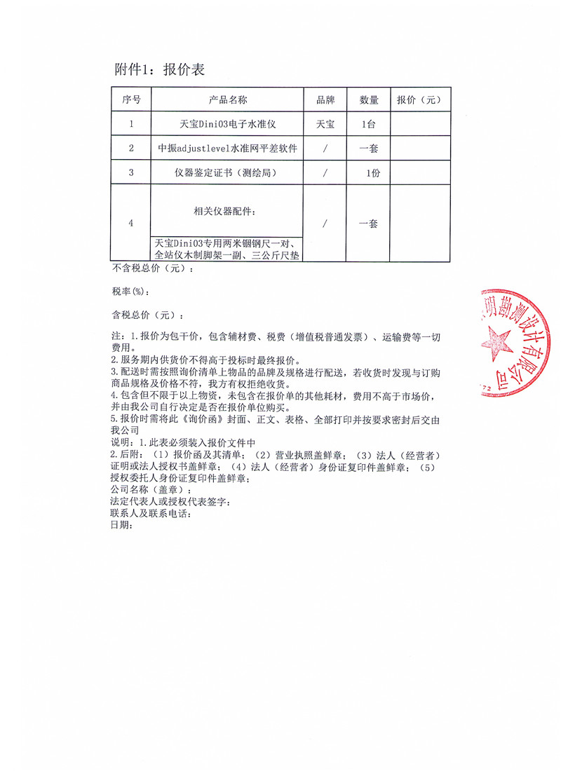 黎明勘測(cè)公司關(guān)于購(gòu)買天寶Dini03電子水準(zhǔn)儀的詢價(jià)函
