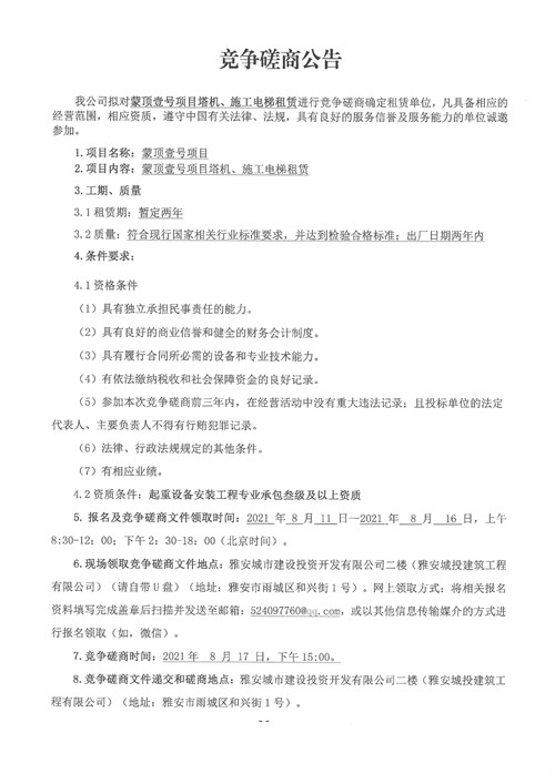 城投建工公司蒙頂壹號項目塔機(jī)、施工電梯租賃競爭磋商公告