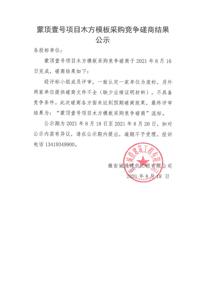 城投建工公司蒙頂壹號項(xiàng)目木方模板采購競爭磋商結(jié)果公示
