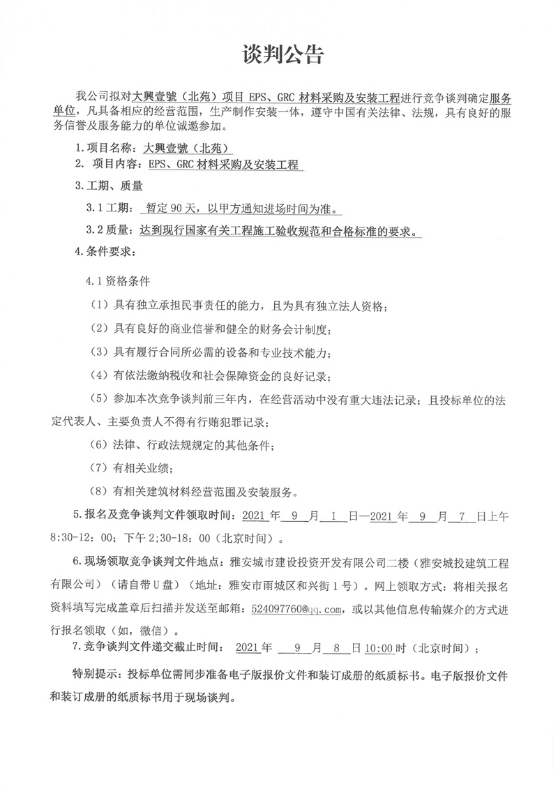 大興壹號(北苑)項目EPS、GRC材料采購及安裝工程競爭談判公告