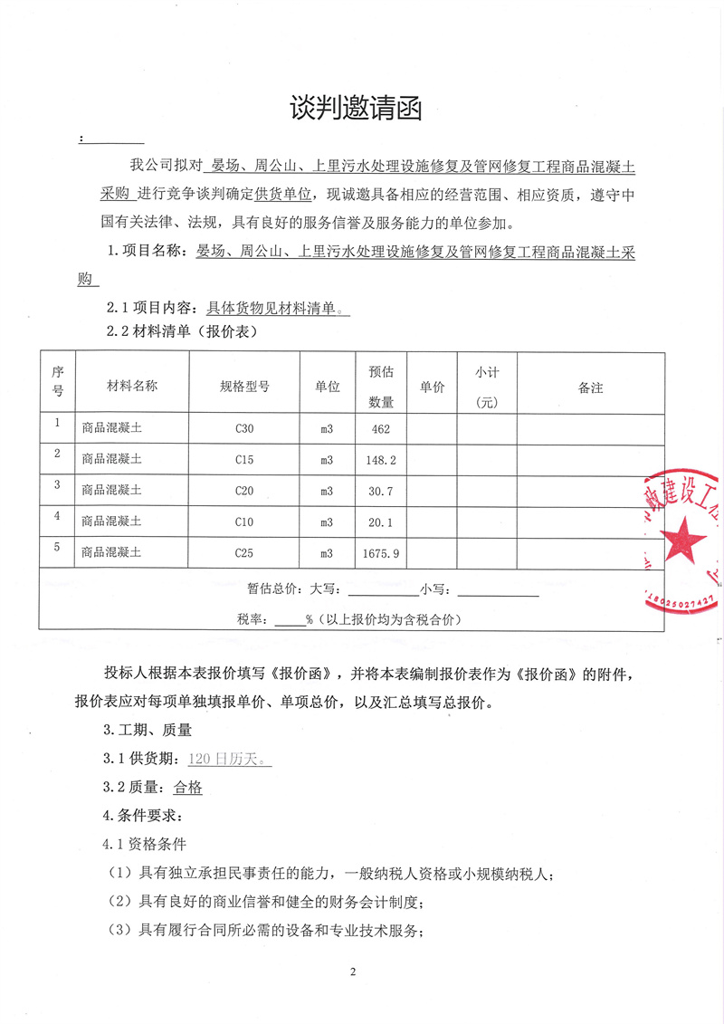 晏場(chǎng)、周公山、上里污水處理設(shè)施修復(fù)及管網(wǎng)修復(fù)工程商品混凝土采購(gòu)競(jìng)爭(zhēng)性談判公告