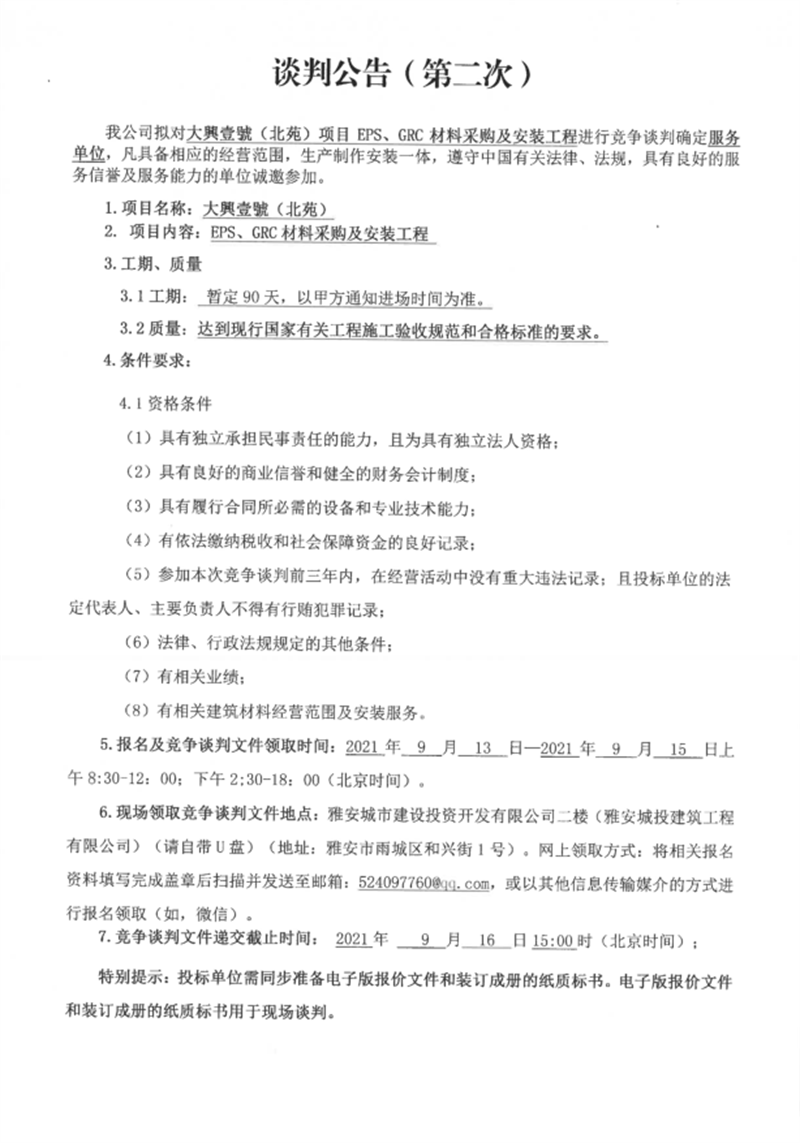 大興壹號(hào)(北苑)項(xiàng)目EPS、GRC材料采購及安裝工程競(jìng)爭(zhēng)談判公告(第二次)