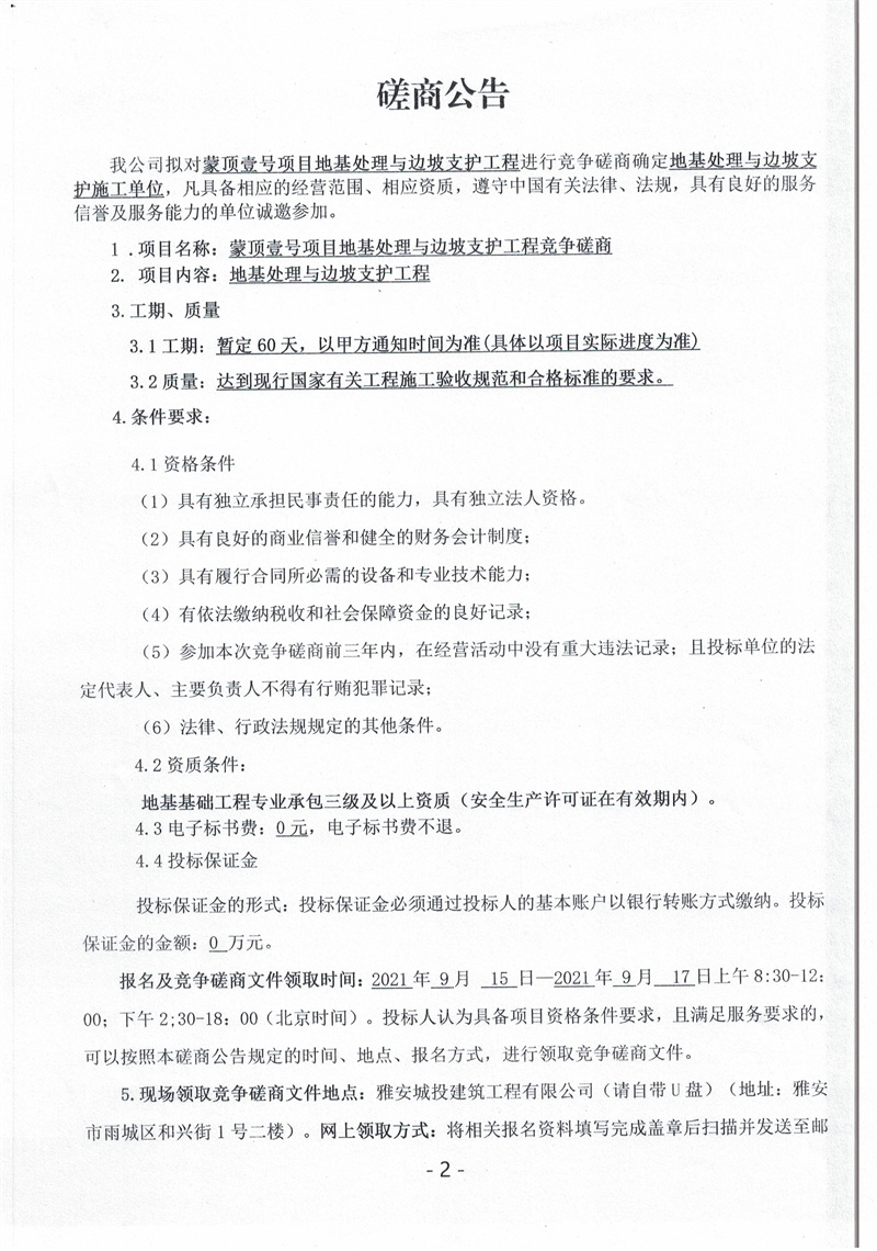 蒙頂壹號項目地基處理與邊坡支護工程競爭磋商公告