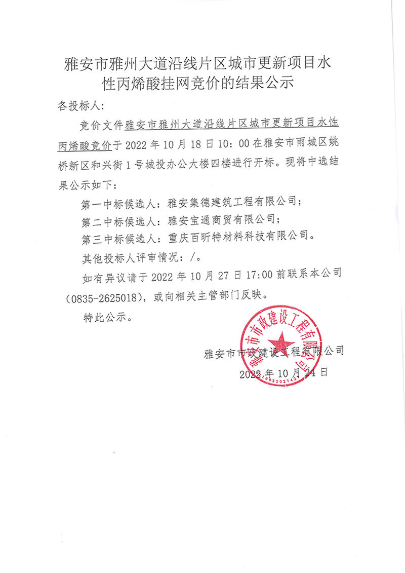雅安市雅州大道沿線片區(qū)城市更新項目水性丙烯酸掛網(wǎng)競價的結果公示