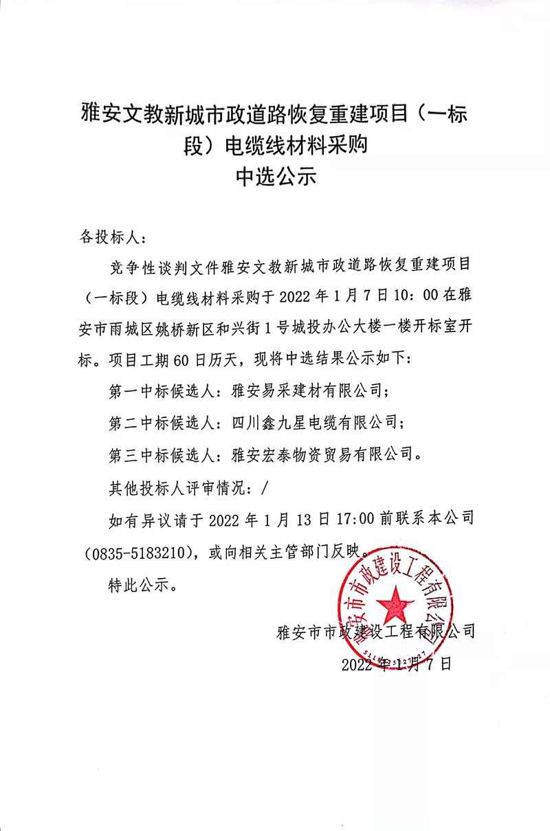 雅安文教新城市政道路恢復重建項目(一標段)電纜線材料采購中選公示