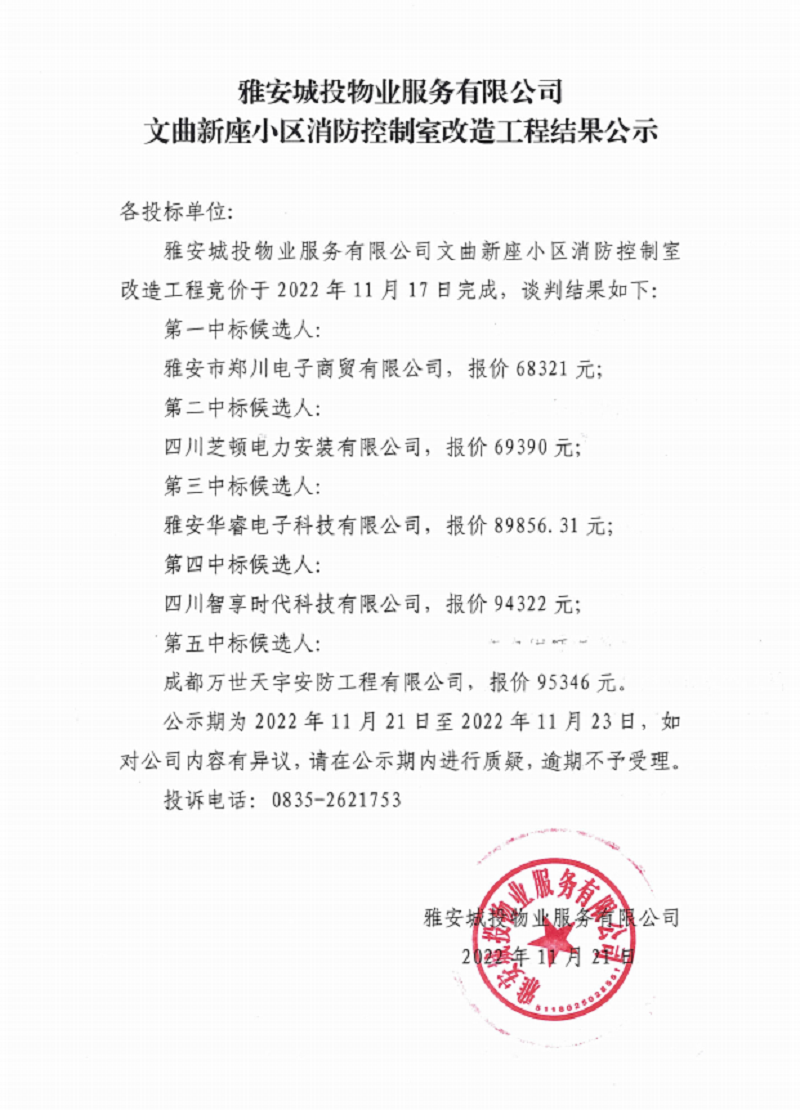 雅安城投物業(yè)服務有限公司文曲新座小區(qū)消防控制室改造工程結(jié)果公示