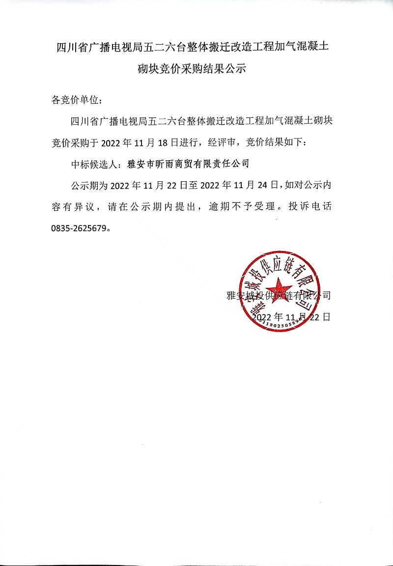 四川省廣播電視局五二六臺(tái)整體搬遷改造工程加氣混凝土砌塊競(jìng)價(jià)采購(gòu)結(jié)果公示