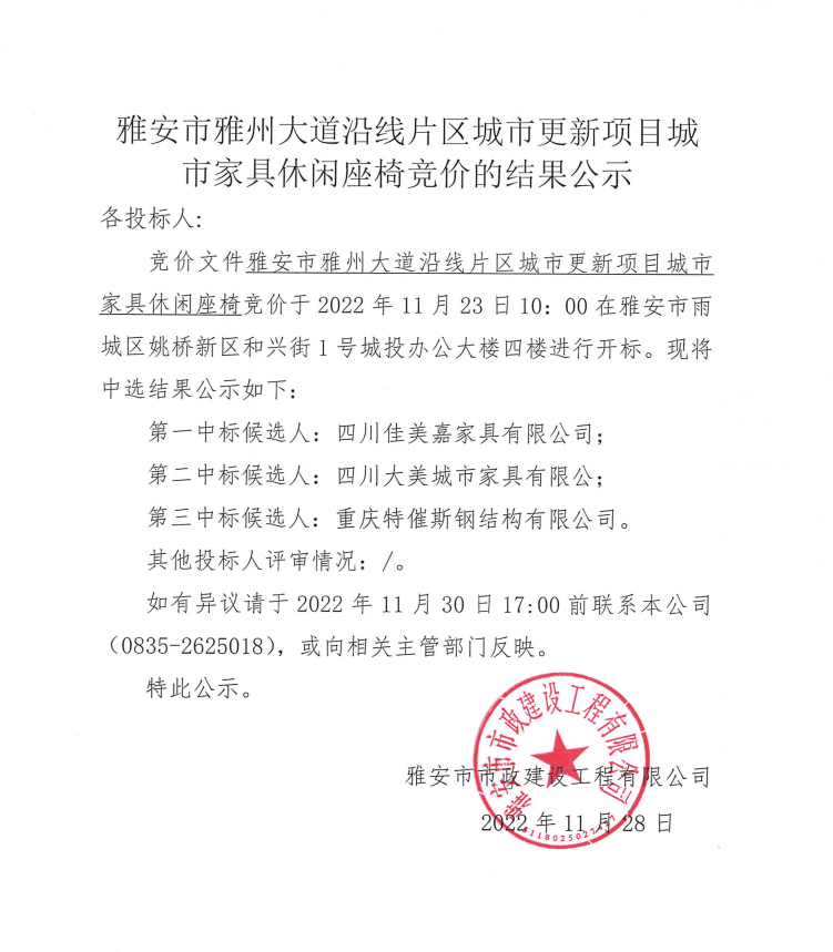 雅安市雅州大道沿線片區(qū)城市更新項(xiàng)目城市家具休閑座椅競(jìng)價(jià)的結(jié)果公示