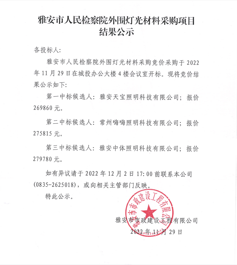 雅安市人民檢察院外圍燈光材料采購項目結(jié)果公示