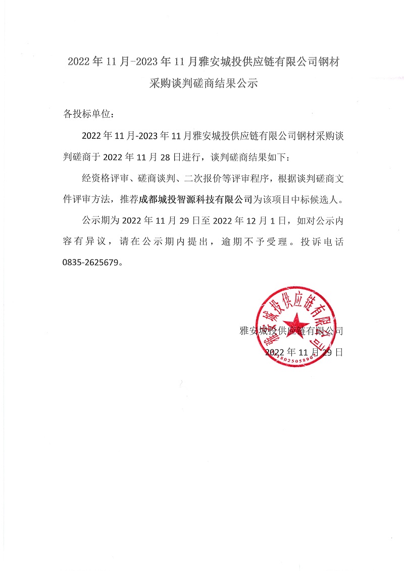 2022年11月-2023年11月雅安城投供應(yīng)鏈有限公司鋼材采購(gòu)談判磋商結(jié)果公示