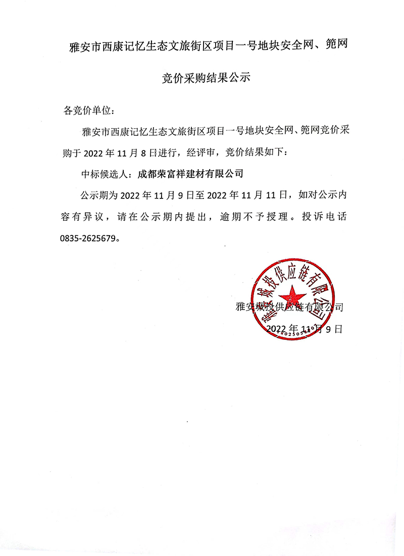 雅安市西康記憶生態(tài)文旅街區(qū)項(xiàng)目一號(hào)地塊安全網(wǎng)、篼網(wǎng)材料采購(gòu)競(jìng)價(jià)結(jié)果公示