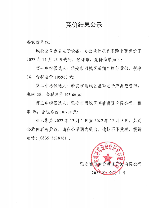 雅安城市建設(shè)投資開發(fā)有限公司辦公電子設(shè)備、辦公軟件項(xiàng)目采購競價結(jié)果公示